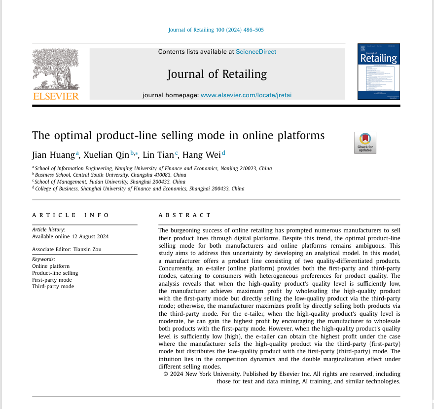 内容简介:已有关于产品线方面的研究绝大多数都是考虑产品设计问题,而文本考虑产品线的销售问题。本研究通过博弈模型分析制造商在在线零售平台销售产品线的最优模式问题,其中产品线包含两种质量存在差异化的产品。与此同时,在线零售平台可以提供自营模式和第三方模式。分析表明,当高质量产品的质量水平足够低时,制造商通过自营模式批发高质量产品,同时通过第三方模式直接销售低质量产品,能够实现利润最大化;否则,制造商通过第三方模式直接销售这两种产品可实现利润最大化。对于零售平台而言,当高质量产品的质量水平处于中等时,它可以通过鼓励制造商以自营模式批发两种产品来获取最高利润。然而,当高质量产品的质量水平足够低(高)时,在制造商通过第三方(自营)模式销售高质量产品,同时以自营(第三方)模式分销低质量产品的情况下,网络零售商能够获得最高利润。其背后的逻辑在于不同销售模式下的竞争动态以及双重边际化效应。