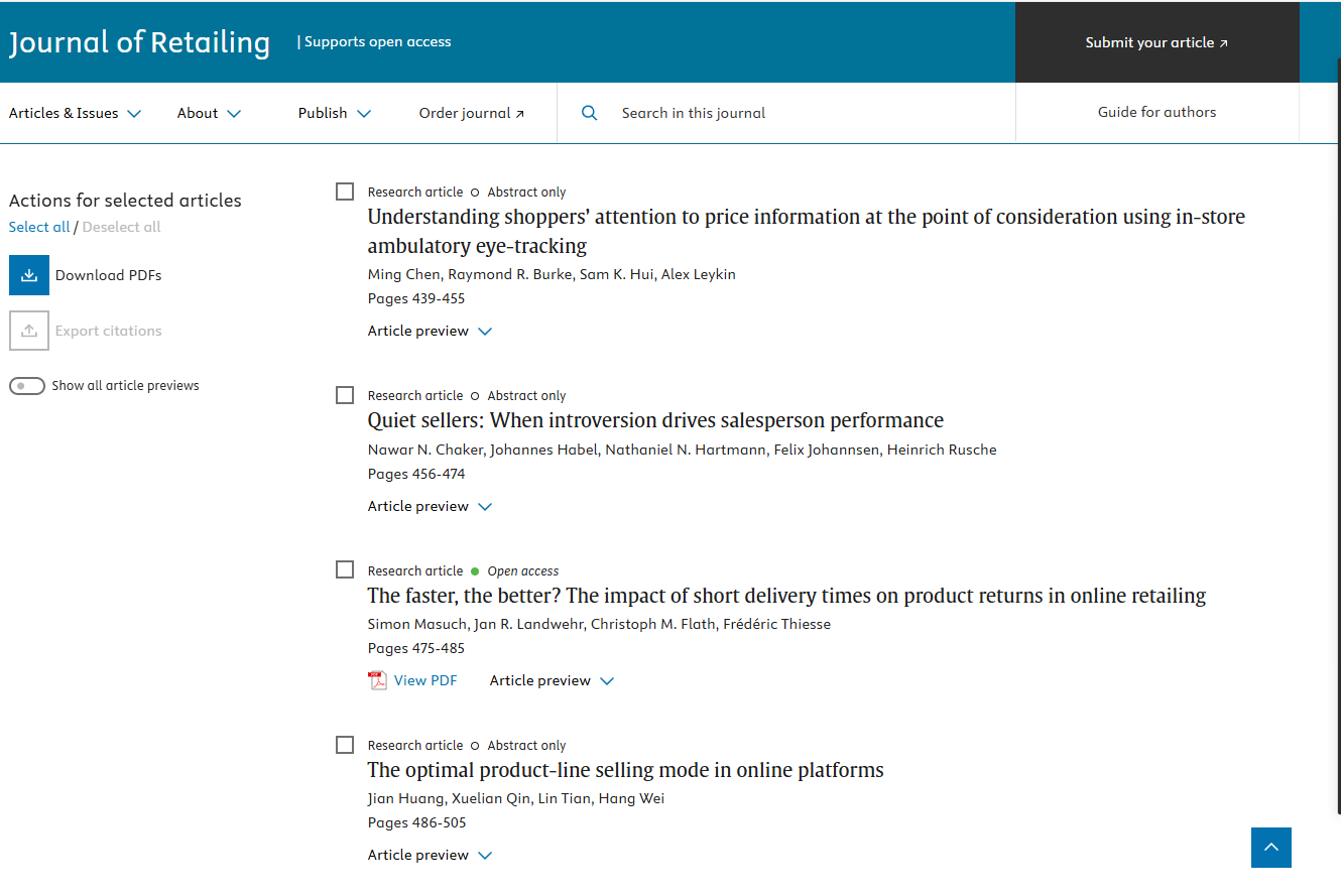 期刊简介:《Journal of Retailing》是国际公认的市场营销学科领域顶级期刊,5年影响因子8.0,国际SSCI一区期刊。该期刊致力于推动零售领域及其管理、发展演变和当前理论等各个方面相关知识水平的提升及其应用。零售领域涵盖产品与服务、为零售商服务的供应链和分销渠道、零售商与供应链渠道成员之间的关系,以及面向家庭的各种形式的直接营销和新兴的电子市场。